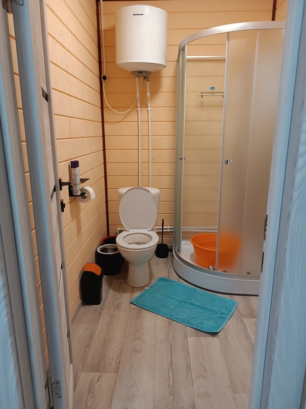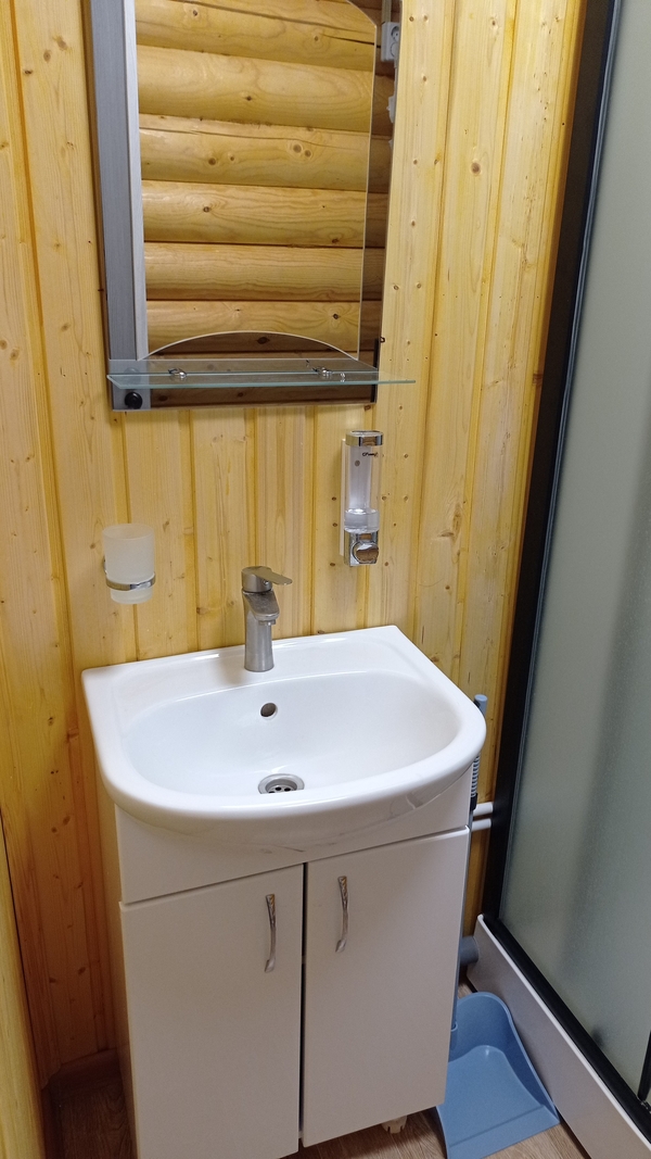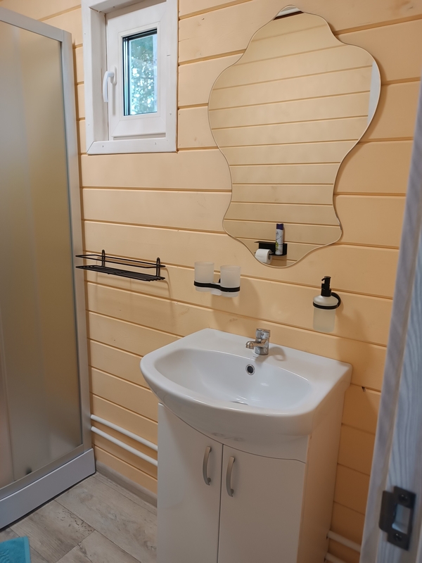 Санузел: раковина, зеркало, душевая кабина, унитаз, водонагреватель.
